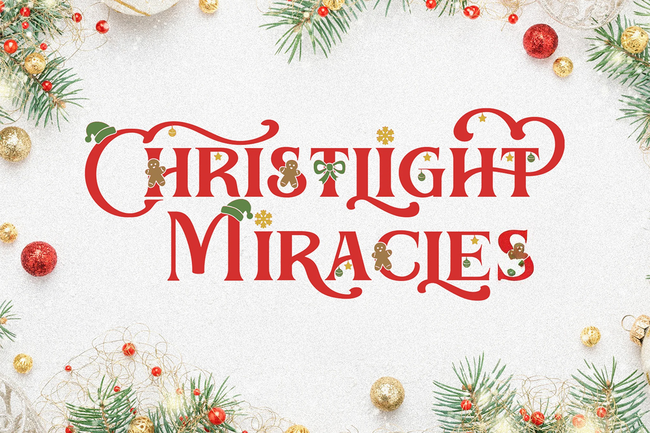 Capture the festive spirit with Chrislight, a decorative serif display typeface designed to shine with holiday elegance. It combines a classic serif foundation with cheerful Christmas-inspired alternates, featuring gingerbread motifs, flowing ribbons, Santa hats, and delicate snowflake ornaments. The result is a warm, joyful, and whimsical typeface that’s perfect for elevating any seasonal design—from print to digital.